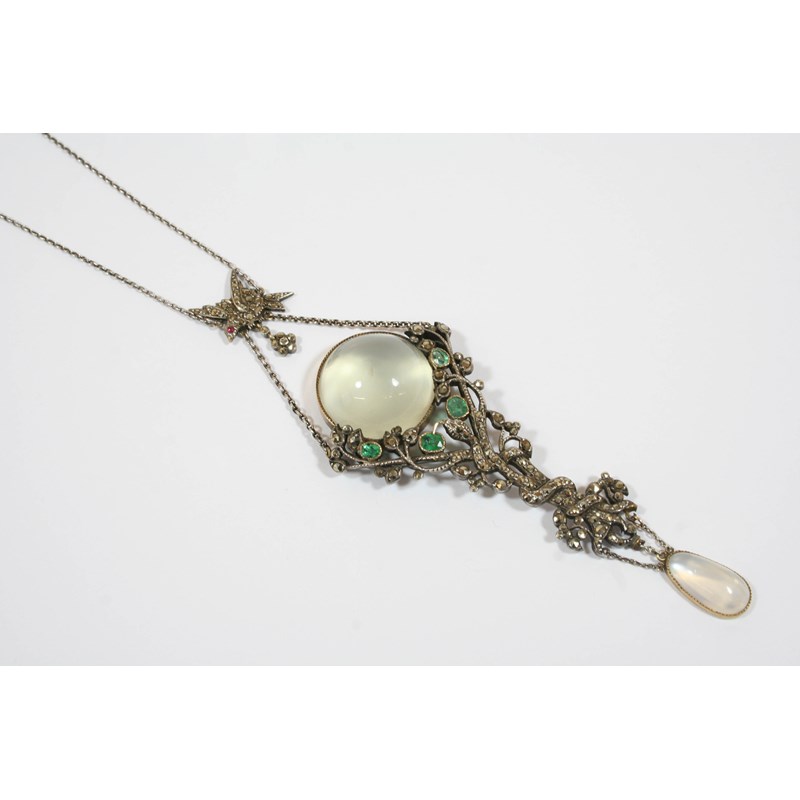 the large circular moonstone is set within an openwork design of a snake climbing a tree, set with emeralds and marcasite stones, suspended from a marcasite set bird, and with an oval moonstone drop, on a fine link chain, the pendant 11.0cm. long.