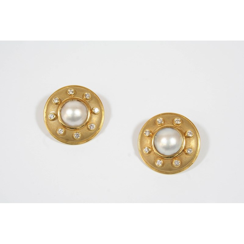 A PAIR OF MABE PEARL, DIAMOND AND GOLD EARCLIPS the circular 18ct. gold mount is set with circular-cut diamonds and centred with a mabe pearl, 3cm. dia.