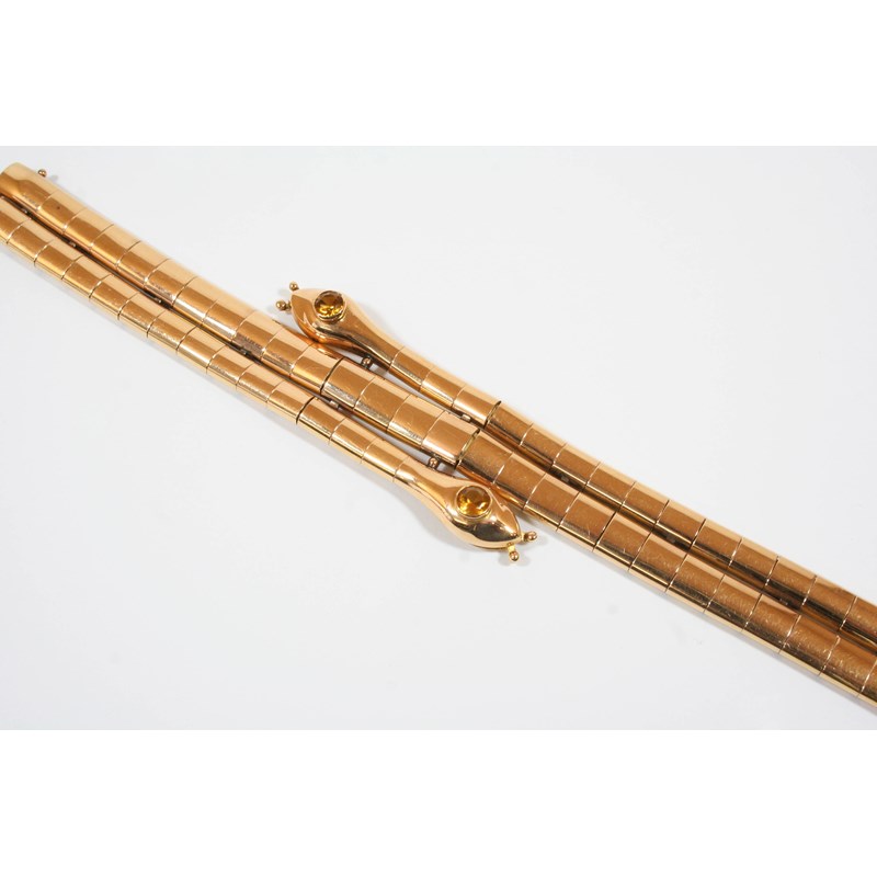 AN 18CT. GOLD ARTICULATED SNAKE BRACELET each head mounted with a circular-cut citrine, 20cm. long, 86 grams.