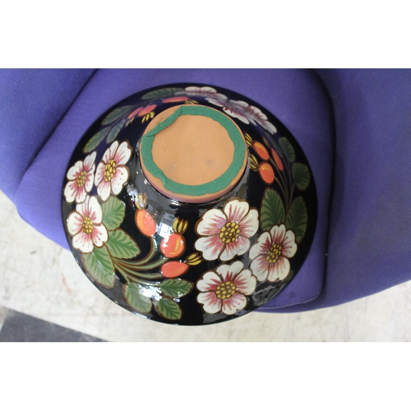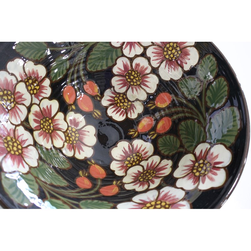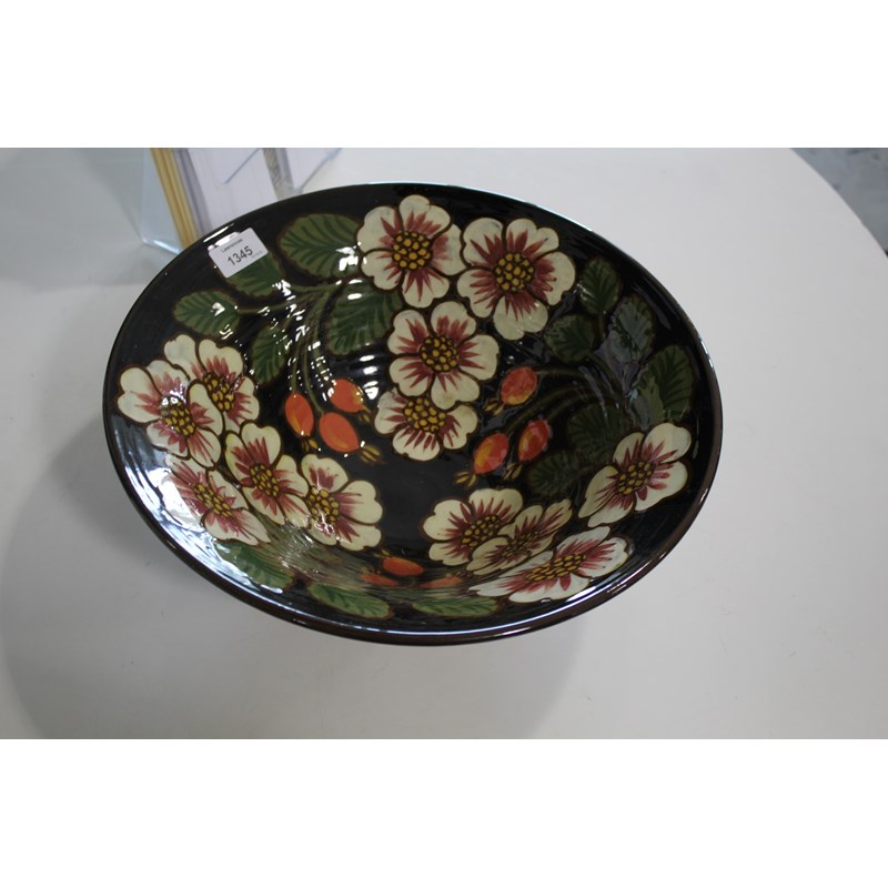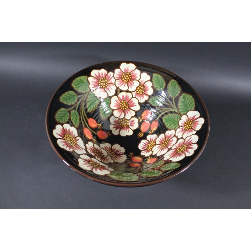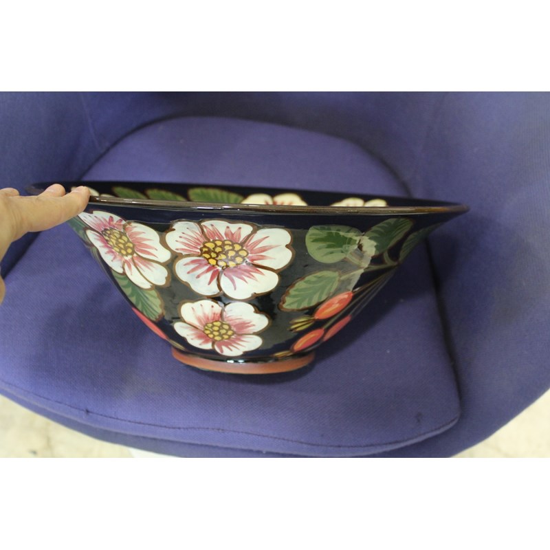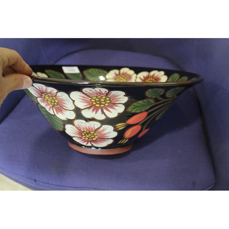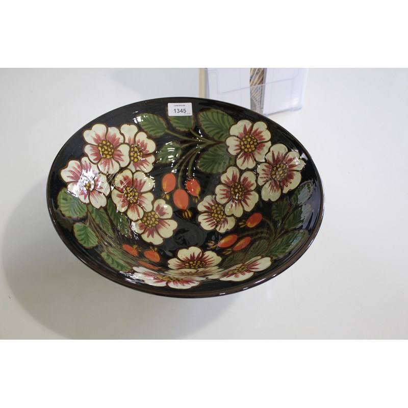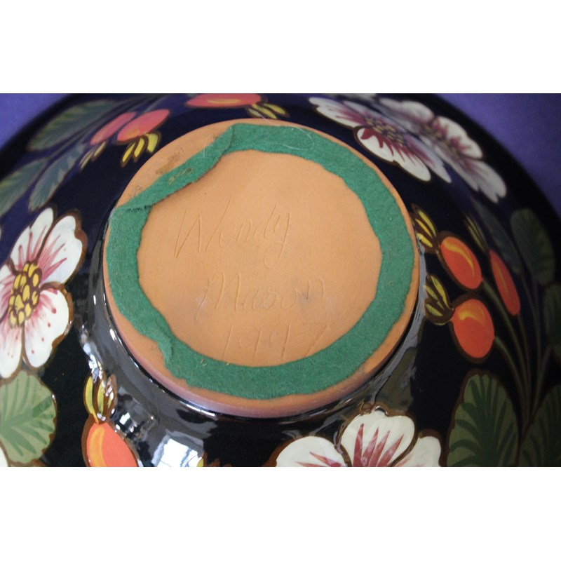 a large pottery fruit bowl, painted to the interior and exterior with flowers and berries. Signed to the base, Wendy Mason, 1997. 14 3/4ins (37.5cms) diameter, 6ins (15cms) high