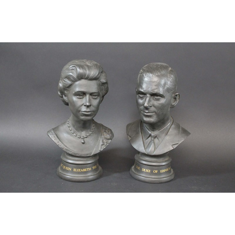 a pair of limited edition black basalt busts of Queen Elizabeth (No 736) and the Duke of Edinburgh (No 736). Made to commemorate the Silver Wedding in 1972. Both marked for Royal Doulton. 11ins (28cms) high. (2)