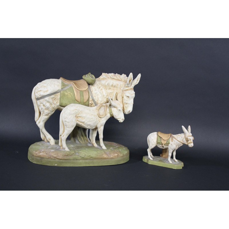 a large pottery group of a Donkey and Foal, painted in typical colours, Model No 2180 (small repair to base). Also with a smaller Royal Dux Donkey, Model No 1112. Both with Royal Dux triangle mark. Large group 10 3/4ins (27.5cms) high. (2)