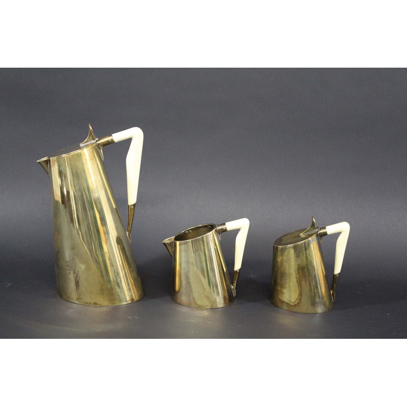 a brass tea set of angular shape, comprising a teapot, lidded sugar bowl and milk jug. The pottery and brass handles also of angular form, unmarked. Teapot 9 1/4ins (23.5cms) high. (3)