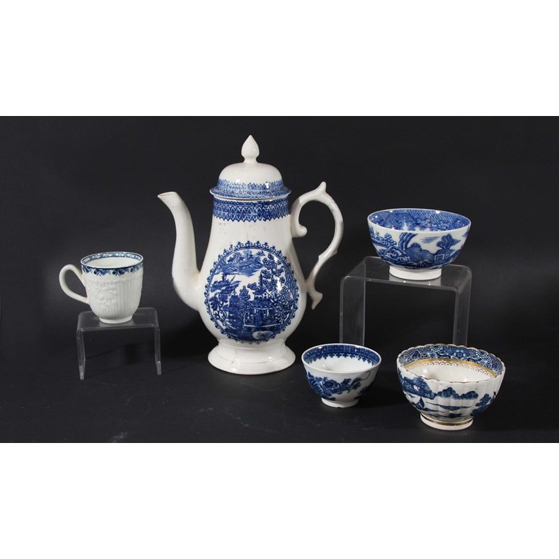 probably Christians, circa 1775, moulded with floral branches on a reeded ground beneath scrolling and an underglaze blue painted rim, height 5.8cm; together with a Liverpool Coffee Pot and Cover, late 18th century, of baluster form, blue printed with an oval chinoiserie landscape, height 22.5cm; two Salopian blue printed tea bowls, S marks; and another blue printed tea bowl (5)