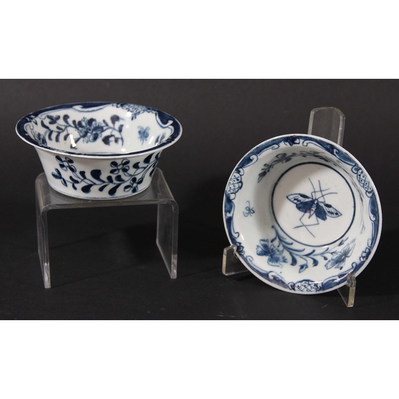 circa 1770, probably Lowestoft, blue painted with insects inside a floral border and scrolling rim, workmans marks, diameter 9cm (2)