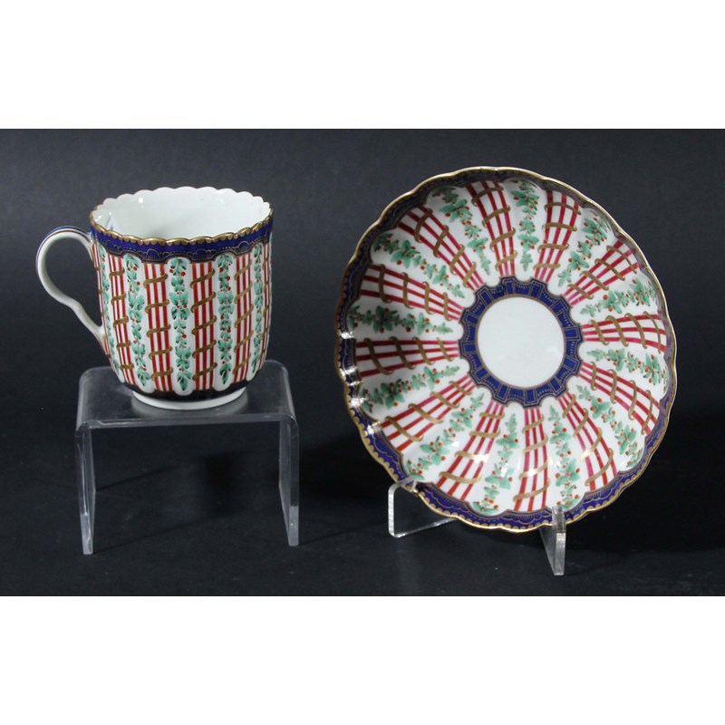 WORCESTER FLUTED COFFEE CUP AND SAUCER, circa 1760, over glaze painted with a trellis pattern in in blue, red, green and gilt, saucer diameter 13cm