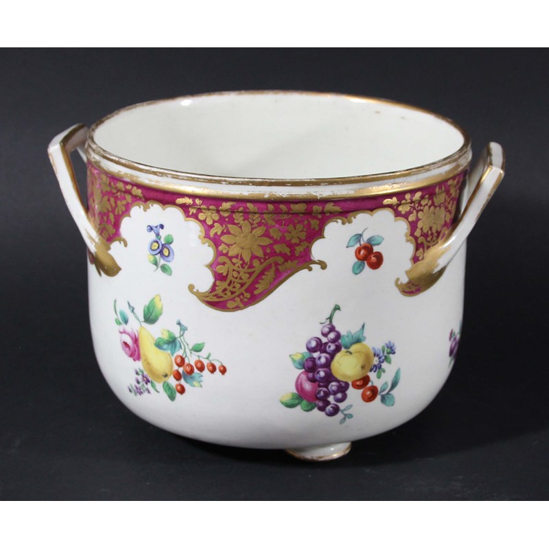 circa 1765-68, painted in the Hope Edwards pattern at the James Giles atelier with fruits and flowers under a claret and tooled gilt border, paper label to base, width 20.5cm