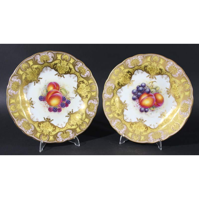 PAIR OF ROYAL WORCESTER PLATES, date code for 1957, by J Freeman, painted with fruit inside a yellow border, black printed marks, diameter 23cm (2)