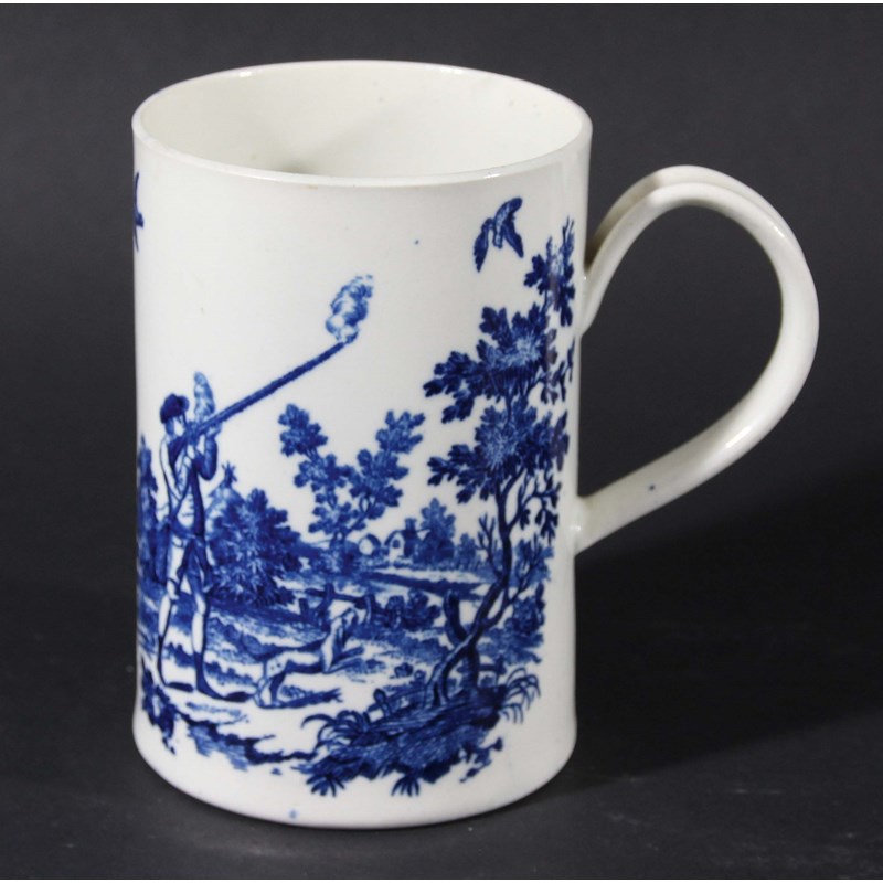 WORCESTER MUG, late 18th century, blue printed in the Man Holding a Gun and Man Shooting a Gun patterns, hatched crescent mark, height 12cm