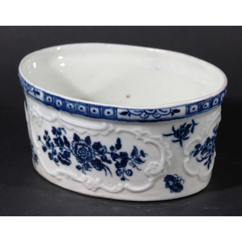 mid 18th century, blue printed in the Mixed Flower Panel Sprays pattern, the interior with the Central Sprays pattern, hatched crescent mark, length 13cm