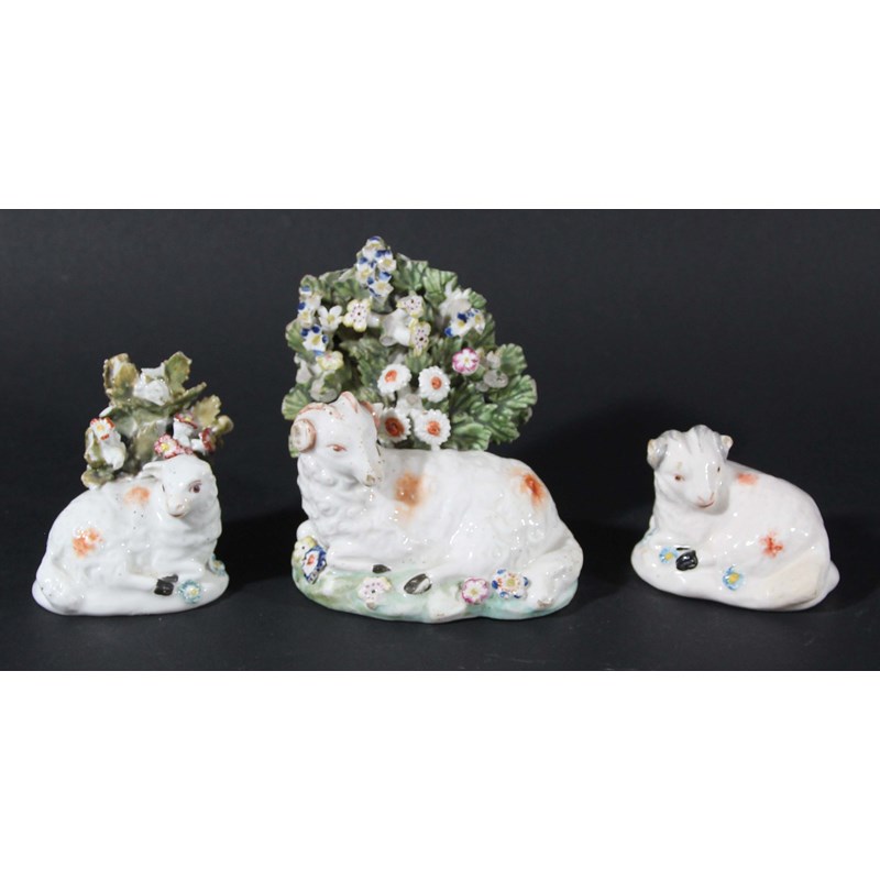late 18th century, to include a ram before bocage, a lamb before bocage and a recumbent ram, two with patch marks, height 10cm and smaller (3)