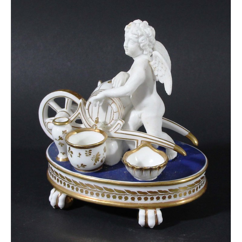 ENGLISH PORCELAIN INKWELL, early 19th century, possibly Chamberlains, Worcester, modelled as cupid resting on a barrel on a wheel barrow, the oval base in dark powder blue, length 14cm