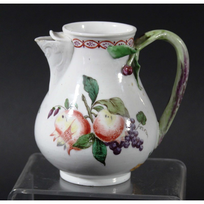 circa 1765, possibly Doccia or Cozzi, of baluster form with twig handle and moulded spout, painted with fruit beneath a stylised border, height 9.5cm