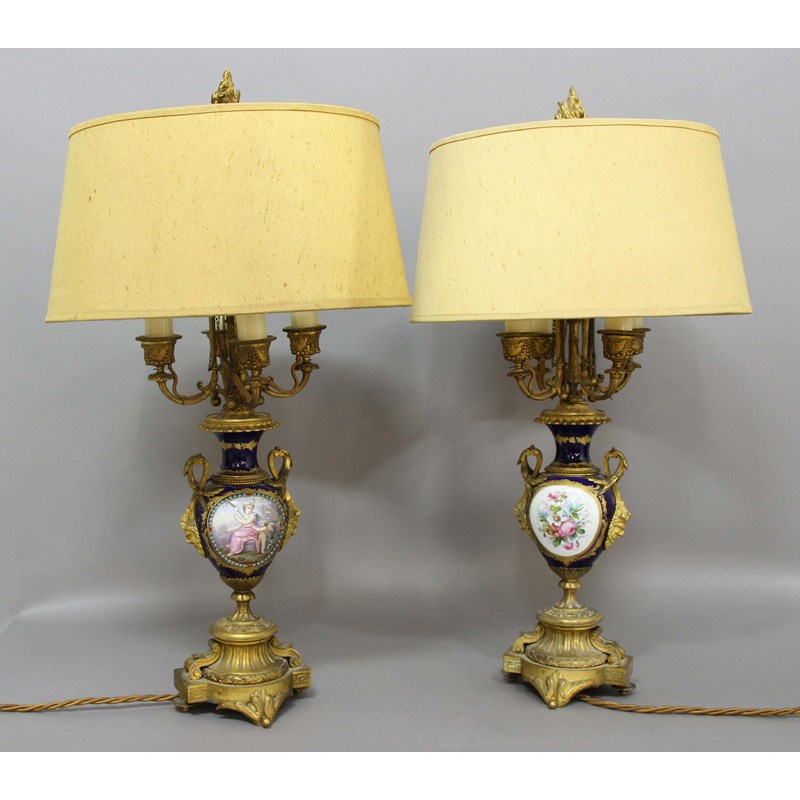 19th century, the Sevres style bodies with painted, romantic roundels in jewelled frames, the reverse with floral cartouches on a cobalt ground, with four lights above satyr mask handles and scrolling feet, height excluding shade 43cm (2)