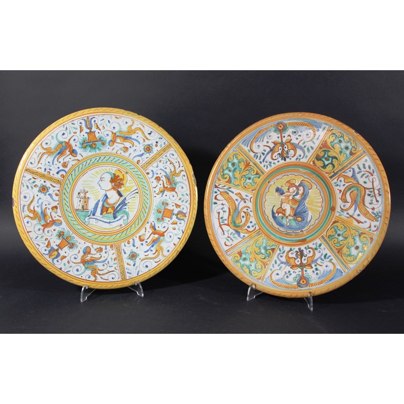 TWO ITALIAN CANTAGALLI STYLE CHARGERS, central portraits of Saint Catherine and the Madonna and child inside a panelled border, diameter 30cm (2)