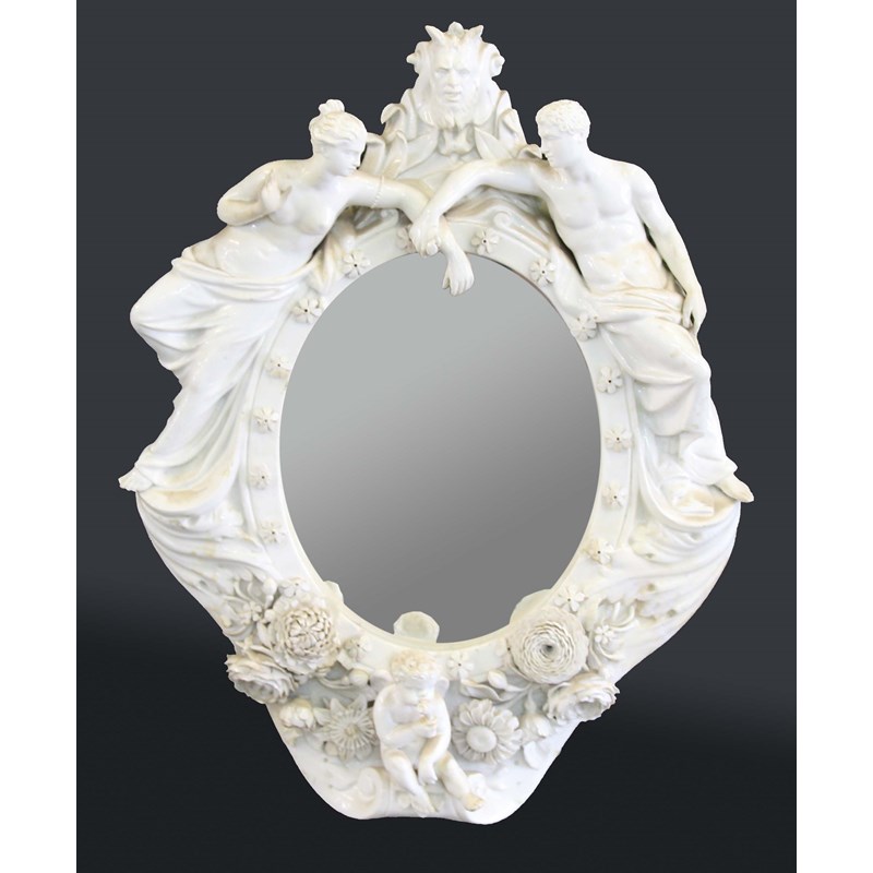 19th century, the oval plate inside a frame centred on a bust of satyr flanked by a classical male and female, the terminal with a cherub surrounded by encrusted flowers, in the white, indistinct signature to base, height 42cm, width 33cm
