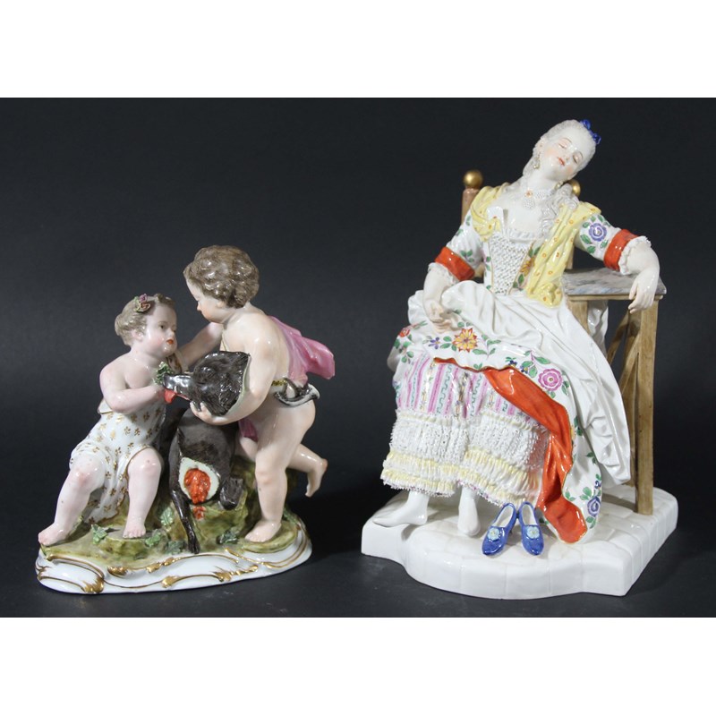 a Meissen figure of a lady asleep in a chair, the letter slipped into her bodice, blue crossed swords marks, incised E58, height 19cm; and a Meissen Marcolini group, of two classical young hunters holding the head of a boar, blue crossed sword and star mark, incised B87, height 14cm (2)