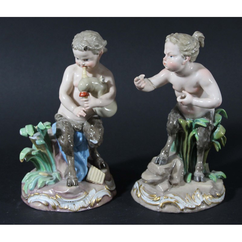 TWO MEISSEN FIGURES OF BACCHANALIAN SATYRS, late 19th or 20th century, one playing bagpipes, cancelled blue crossed sword marks, height 16cm (2)
