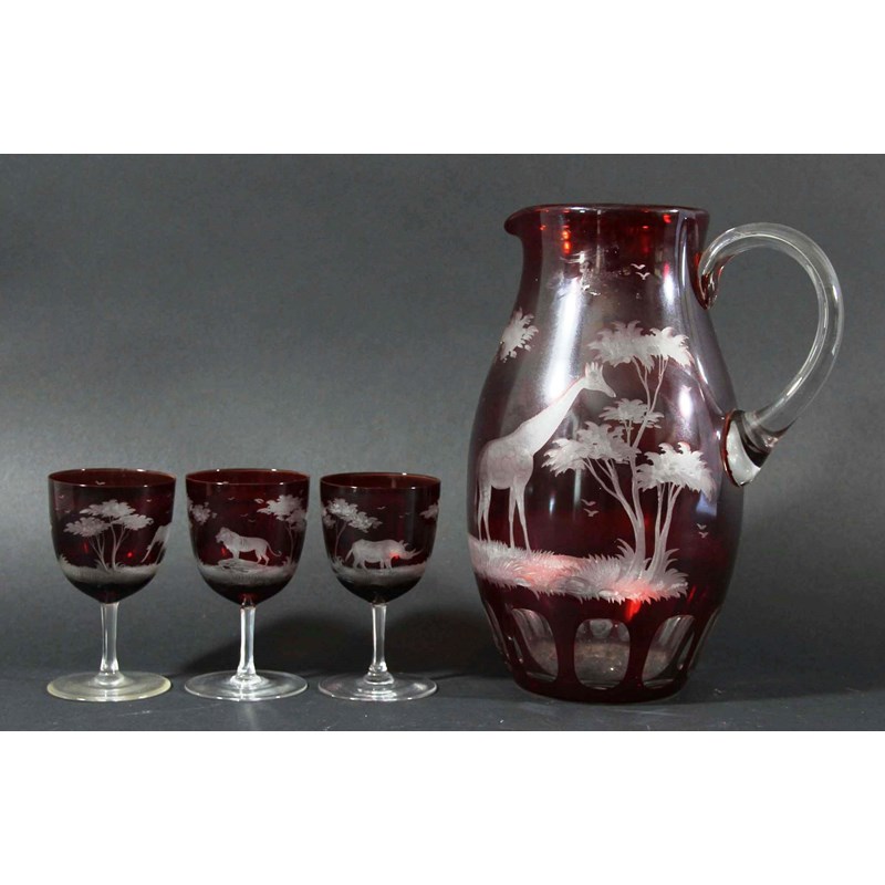 red cut through to clear with various African safari animals, comprising a ewer and six glasses, height of ewer 24cm (7)