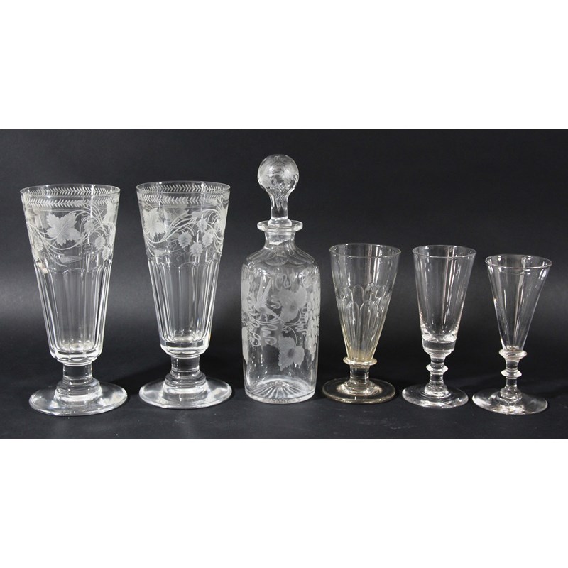 early/mid 19th century, engraved with hops above a faceted base, short stem and spreading foot, height 19.5cm; together with a collection of 18 wine glasses and flutes and a decanter and stopper (21)