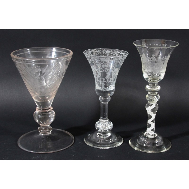 possibly Continental and 18th century, the conical bowl engraved with a crest of military trophies, polished roundels verso, a heavy knopped stem and slight, conical foot, height 18cm; a continental wine glass, probably late 18th century, the bell shaped bowl probably later engraved with a crest and foliage, on a stem with a shoulder and large basal knop with beads and domed foot, height 17.5cm; and another,