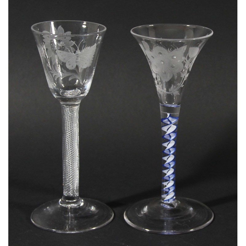 the trumpet shaped bowl engraved with a rose and moth on a blue and white double spiral on a spreading foot, height 15.5cm; and another with the rounded bowl with similar engraving on a multiple strand air twist stem and slightly domed foot, height 16cm (2)