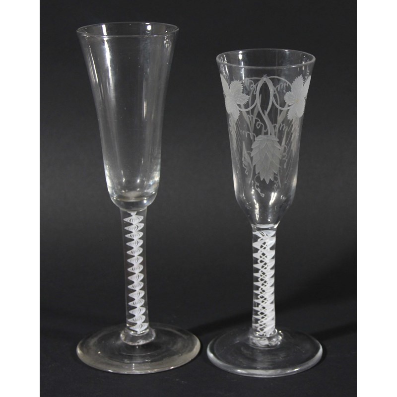 late 18th century, the slender bowl engraved with hops and barley above stem with a double helix inside a double, mutli ply helix and spreading foot, height 19cm; together with another, similar but with a plain bowl and a white, multi-strand twist, height 20cm (2)