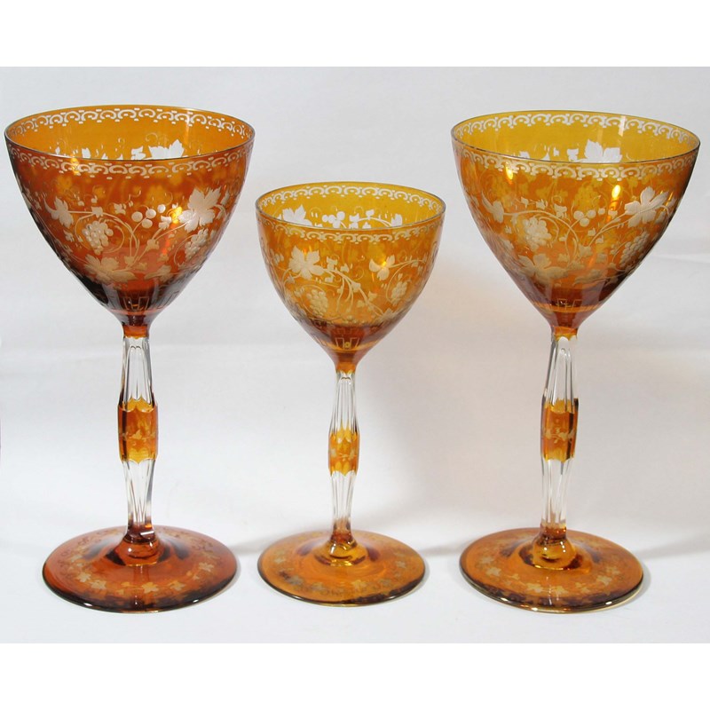 amber cut through to clear, the rounded bowls engraved with scrolling, fruiting vines, on a hollow, faceted stem and spreading foot, to include a larger pair and set of four smaller, heights 17cm and 14.5cm (6)
