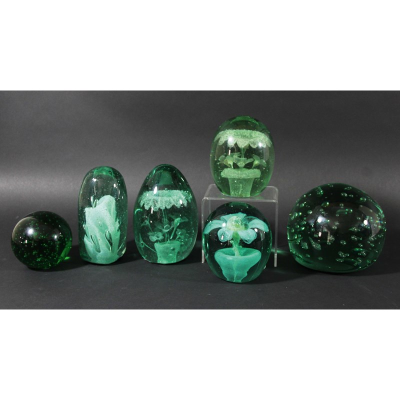 COLLECTION OF SIX GREEN GLASS DUMPS OR ORNAMENTS,