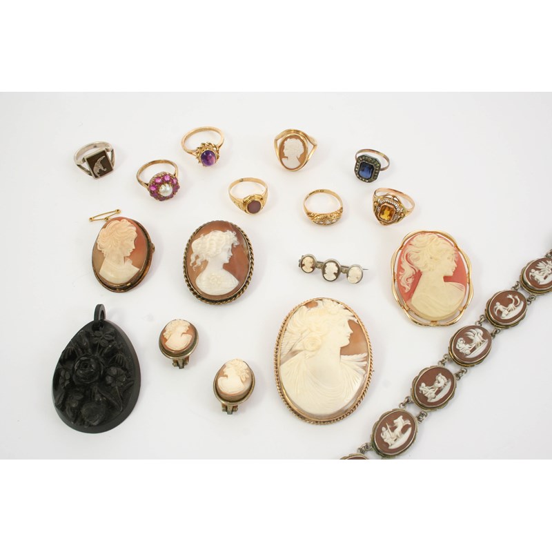 A QUANTITY OF JEWELLERY including various carved shell cameo brooches and a bracelet, and various other items.