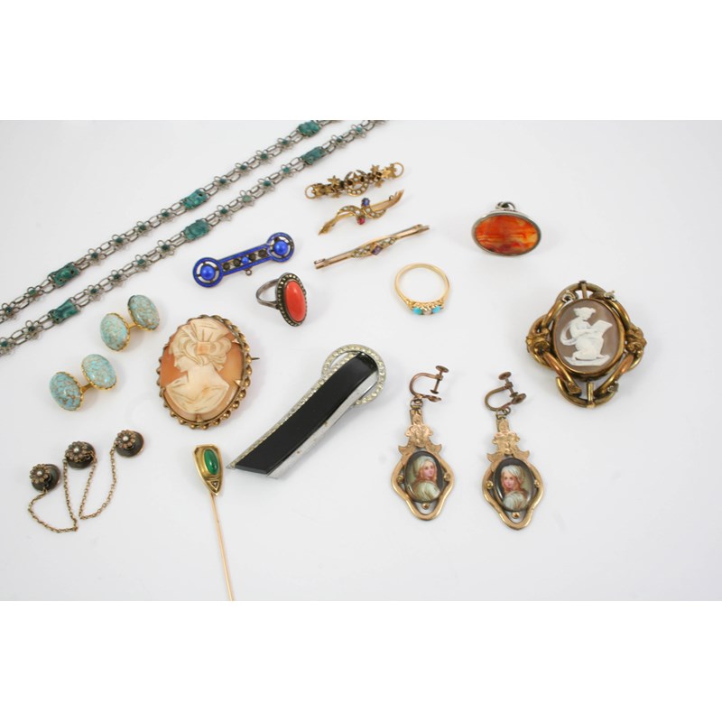 including a Victorian shell cameo brooch, a coral and marcasite ring, a turquoise and diamond ring, set in gold, a gold stick pin set with a small diamond and a green stone, possibly chrysoprase, an agate and silver seal, and various other items.