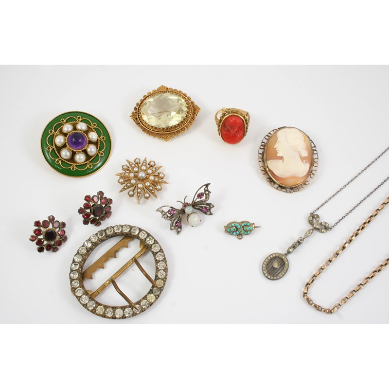 including a gem set butterfly brooch, a paste set circular buckle, a Victorian gold and half pearl star burst brooch pendant, a carved coral cameo ring, set in gold, a 9ct. gold chain, a paste set pendant and various other items.
