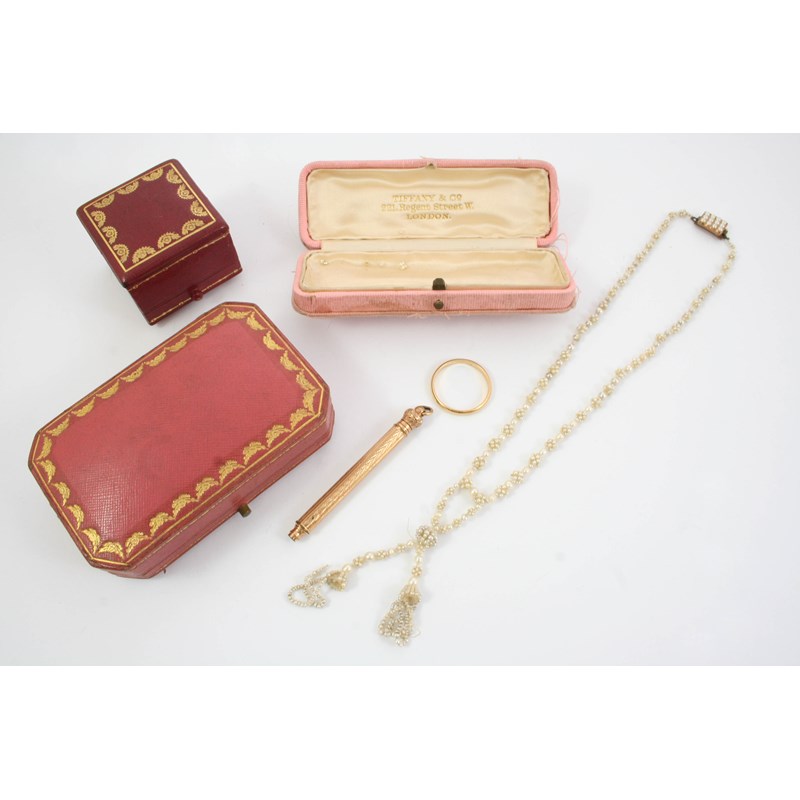 THREE JEWELLERY BOXES two by Cartier and one by Tiffany & Co., together with a Victorian seed pearl neckace, a propelling pencil etc.
