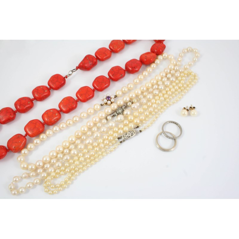 millegrain set with circular-cut diamonds, size P, together with a diamond half hoop ring, set with circular-cut diamonds, in 18ct. white gold, size P, three cultured pearl necklaces, a pair of cultured pearl stud earrings and a coral necklace.