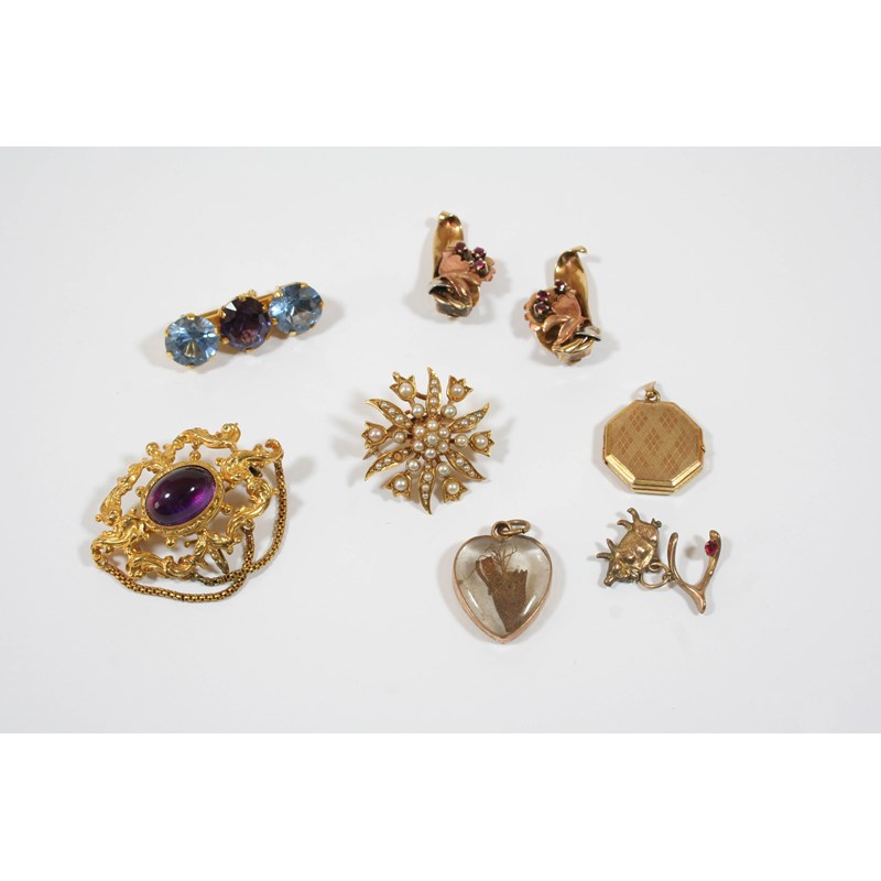 A QUANTITY OF JEWELLERY including a Victorian gold and half pearl flowerhead brooch, a cabochon amethyst and 9ct. gold brooch, a pair of gold and gem set earclips and various other items.