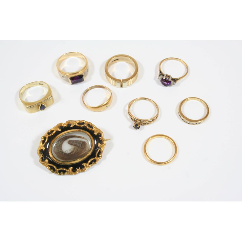 including a Victorian black enamel and gold mourning brooch, the centre section containing hair, a 22ct. gold wedding band, 3.2 grams, two 14ct. gold and gem set rings, 11.0 grams and five 9ct. gold and gem set rings, 16.3 grams.