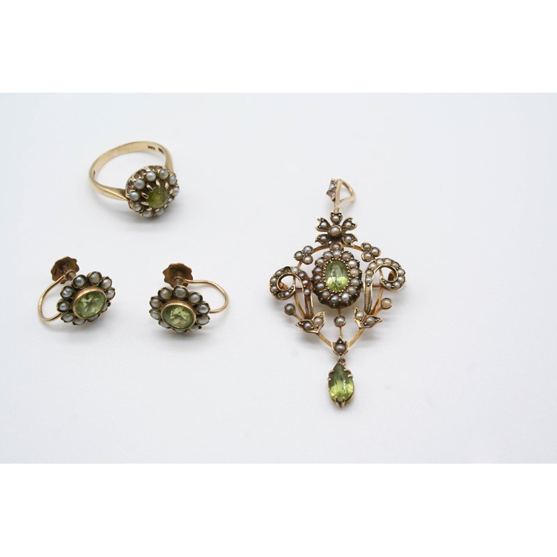 the openwork foliate gold mount is set with an oval-shaped peridot with half pearls, and suspends a pear-shaped peridot drop, 6cm. high, together with a pair of peridot and half pearl cluster earrings, in gold, with screw fittings and a peridot and half pearl cluster ring, set in gold, size K 1/2.