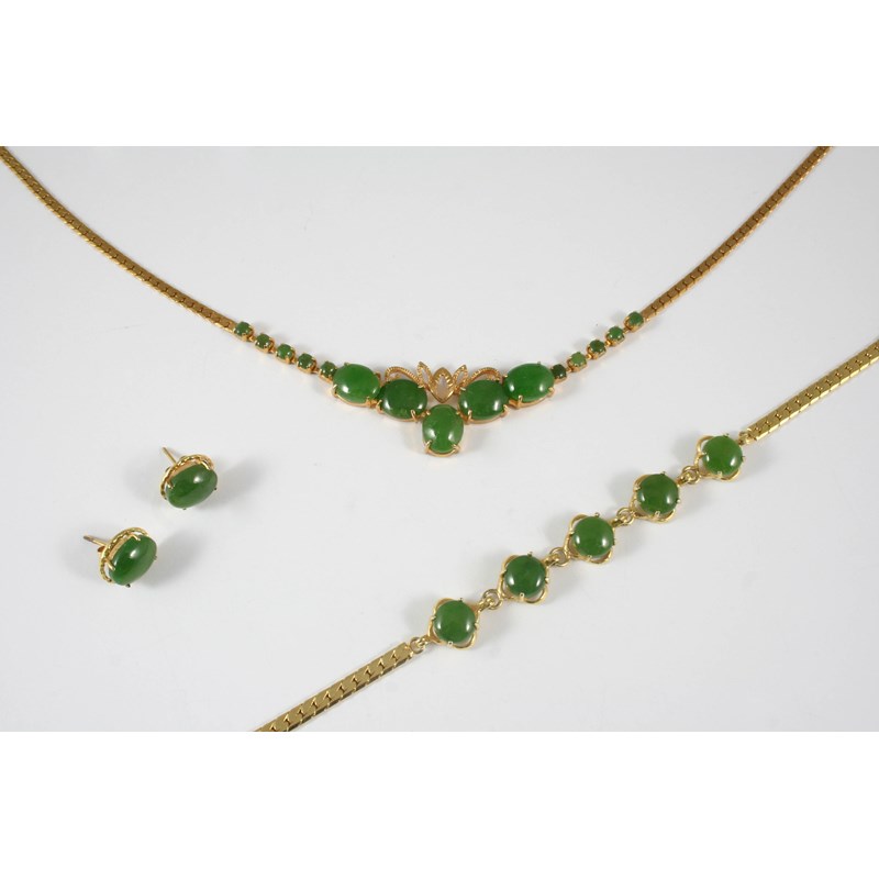 formed with five oval jade cabochons, with small jade cabochons set to the gold necklace, 42.5cm. long, together with a gold bracelet set with five circular jade cabochons, 20.5cm. long, and a pair of jade and gold stud earrings.