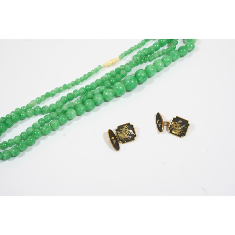 A SINGLE ROW GRADUATED JADE BEAD NECKLACE the jade beads graduate from approximately 3.8 to 11.7mm., 75cm. long, together with a pair of shakudo cufflinks, depicting huts amongst trees, in gold mounts.