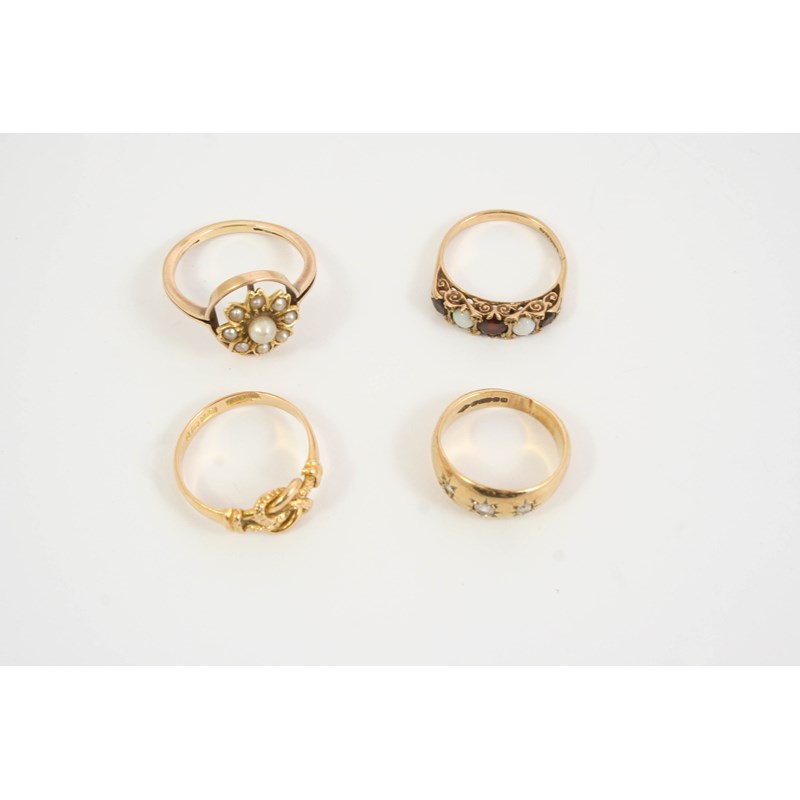AN 18CT. GOLD KNOT RING 3.8 grams, size P 1/2, an opal and garnet ring, set in 9ct. gold, size O, a 9ct. gold ring set with white stones, size L 1/2 and gold and pearl set flowerhead ring, size S 1/2.
