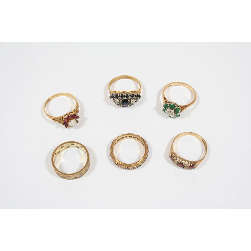SIX ASSORTED 9CT. GOLD AND GEM SET RINGS total weight 17.4 grams.