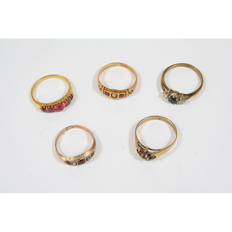 A RUBY, HALF PEARL AND 15CT. GOLD RING size O, 2.7 grams, a sapphire and diamond three stone ring, set in 9ct. gold, 1.9 grams, and three other gold and gem set rings, 6.5 grams.