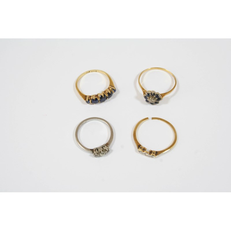A DIAMOND THREE STONE RING set with three circular-cut diamonds, in platinum, size L, together with another diamond three stone ring, set in gold, damaged, and two other gem set rings.