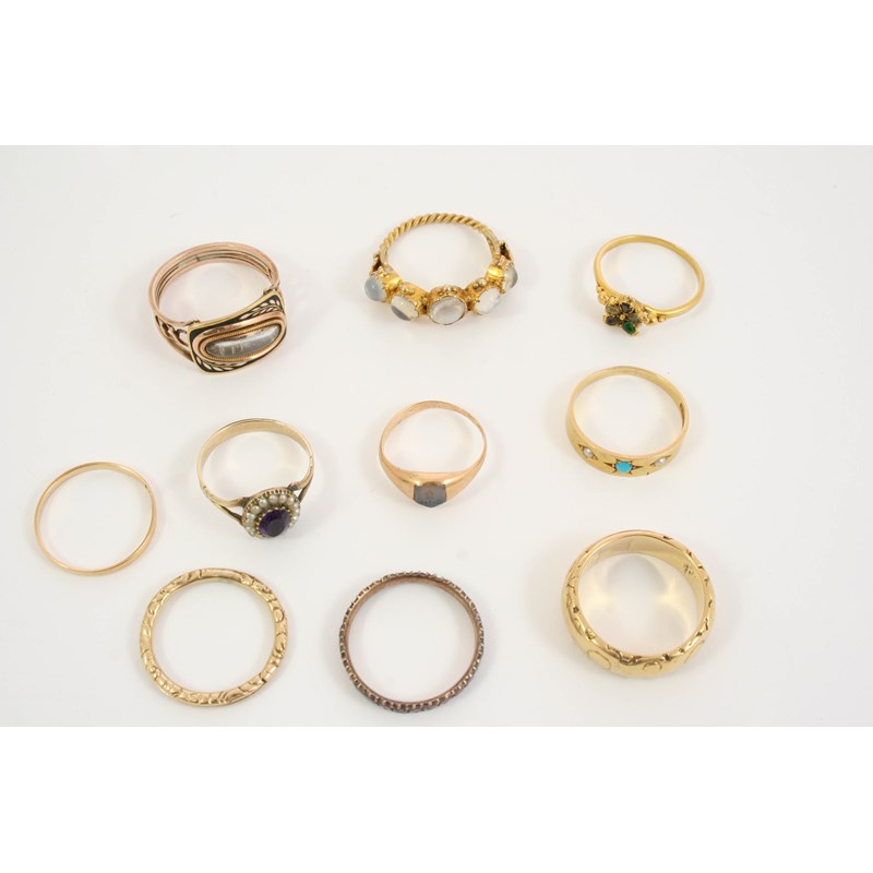 the five graduated moonstones are mounted in a gold foliate mount in closed back settings, size O 1/2, a Georgian gem set and gold ring, size J, a Victorian enamel and gold mourning ring, size R 1/2, an amethyst and pearl cluster ring, set in gold, size L, an 18ct. gold ring set with turquoise and two small pearls, size N, a gold engraved wedding band, 10.2 grams, size O 1/2, a garnet set eternity ring, size P 1/2, a small gold signet ring and two other rings.