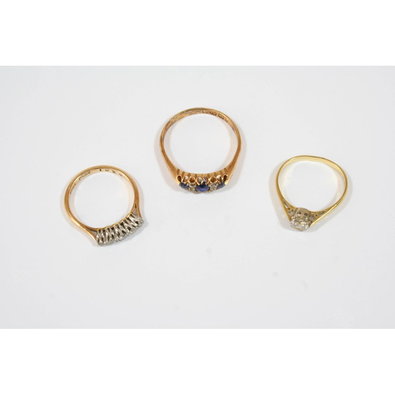 set with a circular-cut diamond, in 18ct. gold, size K 1/2, a diamond five stone ring, set with five graduated circular-cut diamonds, in 18ct. gold and platinum, size M, and a sapphire and diamond ring, set with three circular-cut sapphires and four circular-cut diamonds, in 18ct. gold, size T 1/2.