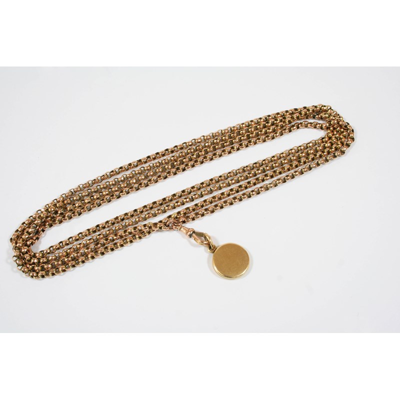 A VICTORIAN 9CT. GOLD LONG GUARD CHAIN formed with circular hammered links, suspending a circular gold locket containing hair, 148cm. long, total weight 36 grams.