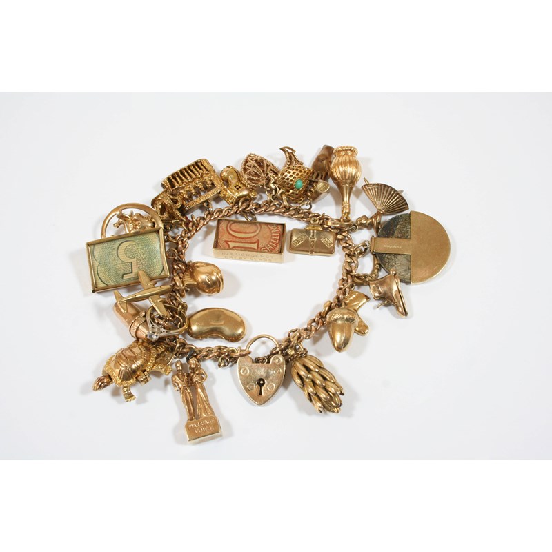 A 9CT. GOLD CURB LINK CHARM BRACELET with padlock clasp and suspending assorted gold charms, total weight 78.9 grams.