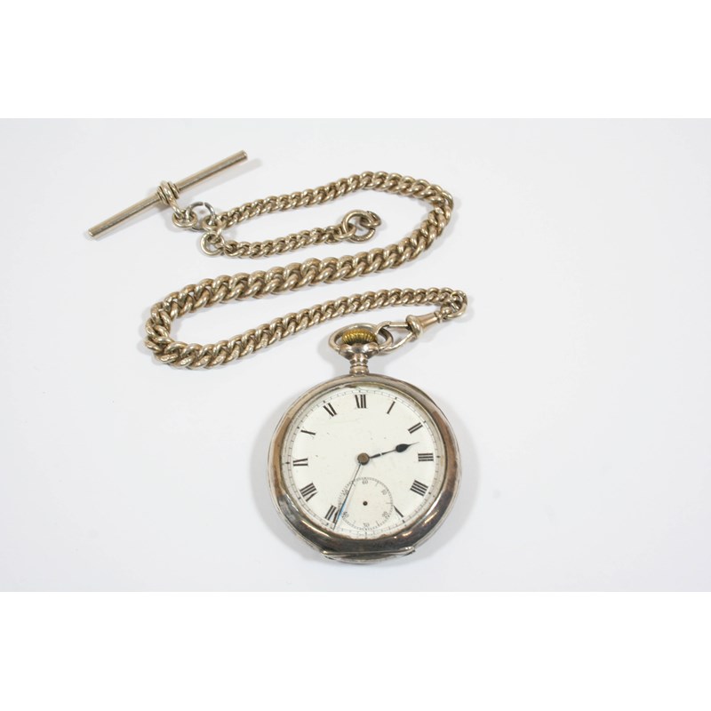A SILVER OPEN FACED POCKET WATCH the white enamel dial with Roman numerals and subsidiary seconds dial (hand missing), the inner case marked for Omega, import mark for London 1911, 40mm. dia., with a silver watch chain.