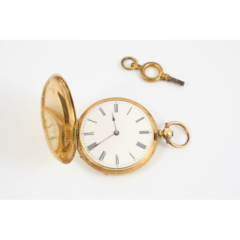 AN 18CT. GOLD FULL HUNTING CASED POCKET WATCH the white enamel dial with Roman numerals, inscribed to the inside case Examined by Dent, Watchmaker to her Majesty and H.R.H The Prince of Wales, 61 Strand and 34 Royal Exchange, London, with engraved foliate decoration to both cases, cartouche and enamel decoration to the front case, 40mm. dia., 41.8 grams. With watch key. With fitted case for E. Dent & Co.