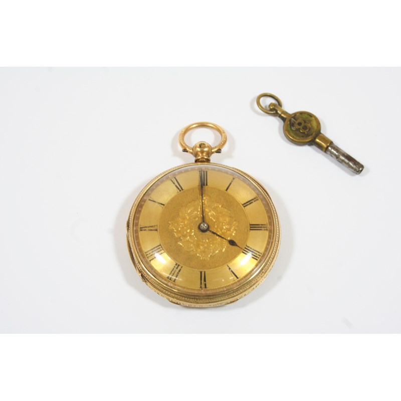 AN 18CT. GOLD OPEN FACED POCKET WATCH the gold dial with foliate engraved decoration and Roman numerals, the movement signed W. Wray, 38 New Street, Birmingham, numbered 22986, with foliate engraved and cartouche decoration to the back case, 40mm. dia. With watch key.